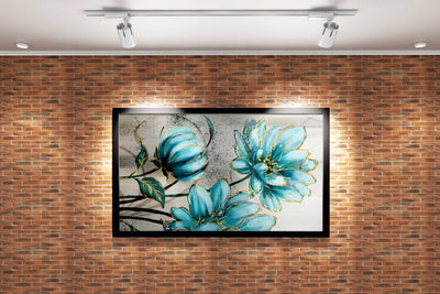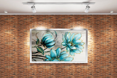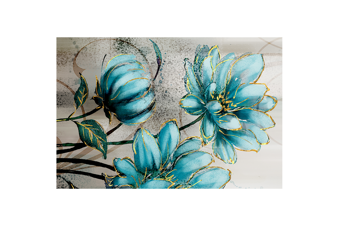 a modern illustration of turquoise flowers outlined with shimmering gold, flower motif, art, kanvas tablo